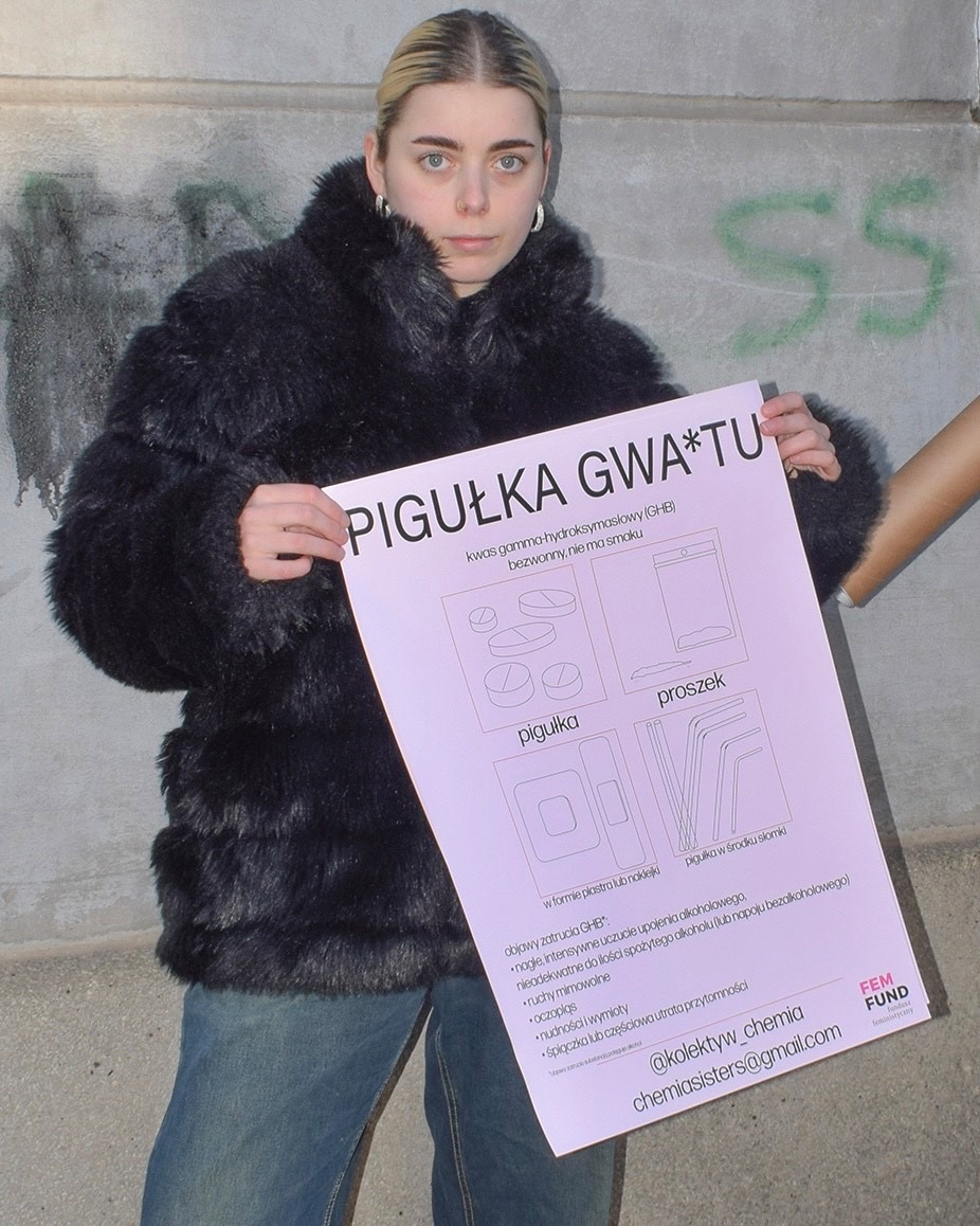 Tzw. pigułka gwałtu to niebezpieczna substancja, o której w Polsce wciąż wiadomo niewiele. Brak oficjalnych statystyk i edukacji na jej temat. W obliczu bierności państwa, można liczyć tylko na oddolne inicjatywy, takie jak Kolektyw Chemia. Ich najbardziej rozpoznawalną kampanią jest akcja plakatowa – charakterystyczne różowe plakaty informacyjne można zobaczyć w wielu miastach w Polsce. Udało mi się porozmawiać z Marią, która sama o sobie mówi „matka kolektywu, która ogarnia wszystko” i z pomocą wolontariuszy z całej Polski edukuje na temat tzw. pigułki gwałtu.